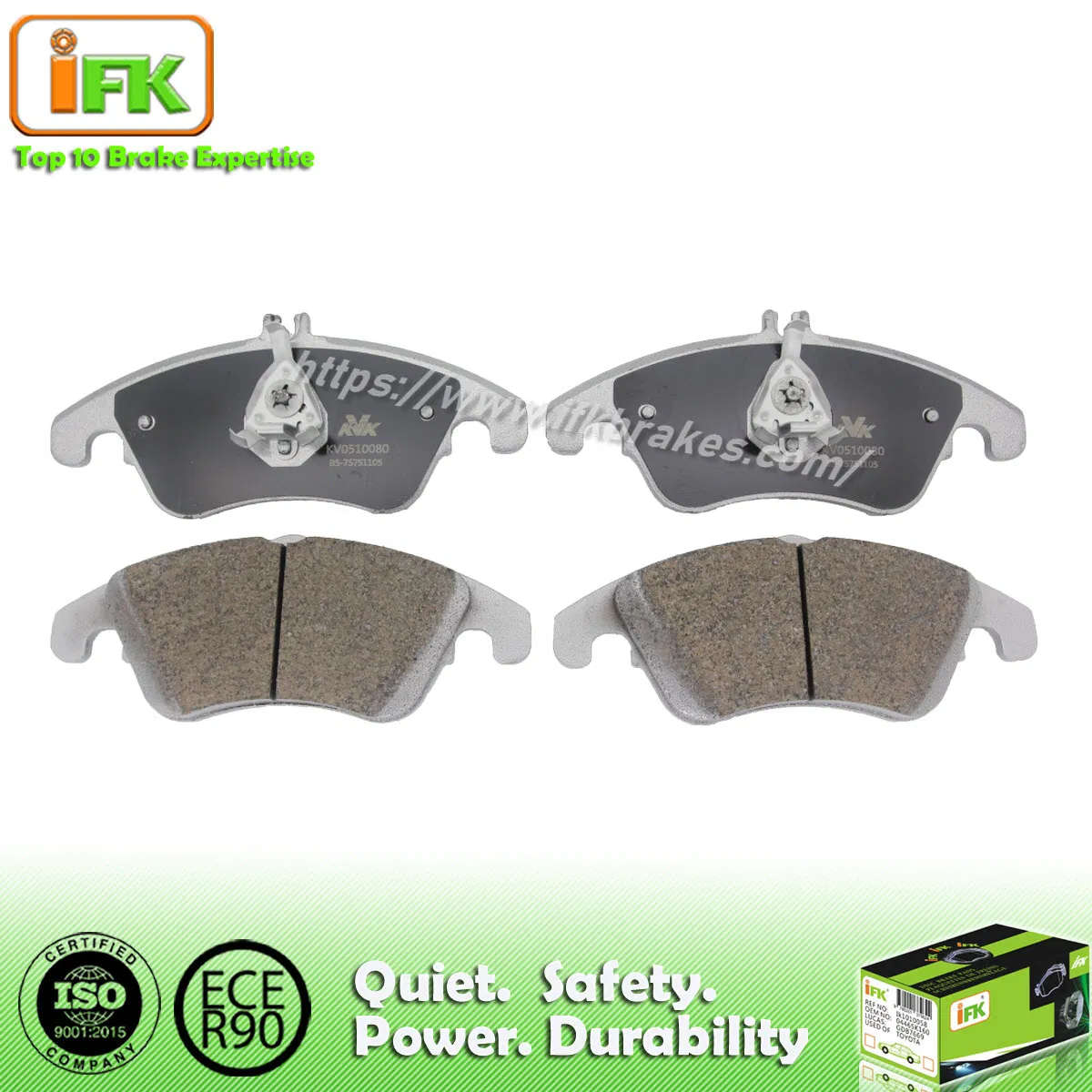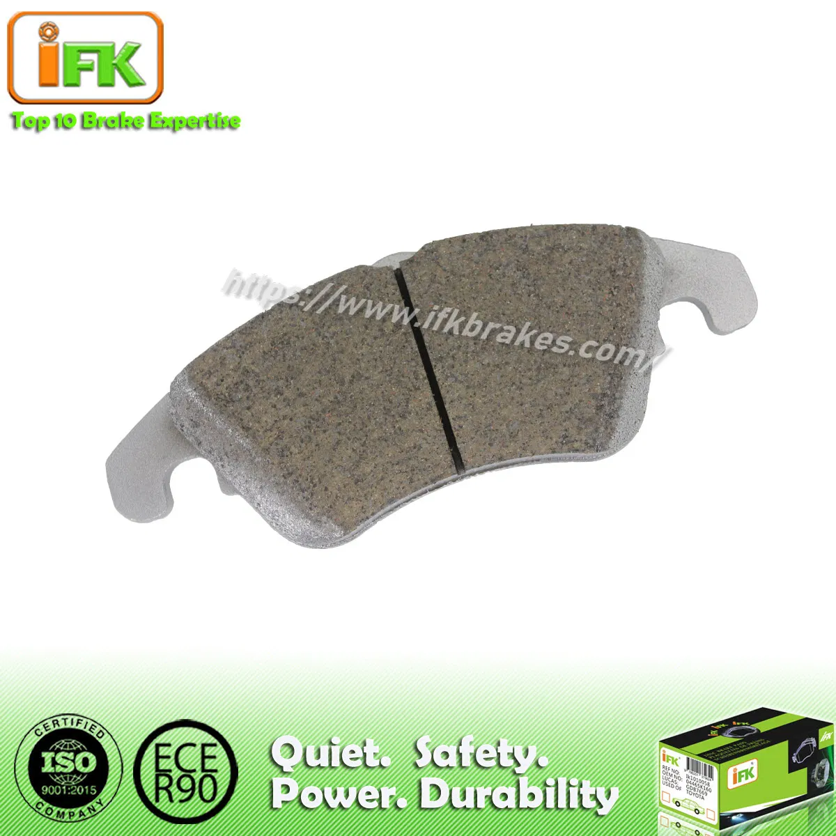 Engineered to reduce brake noise, our brake pads effectively eliminate noise, vibration, and harshness (NVH). IFK Ceramic Brake Pads' innovative ceramic braking technology delivers ultra-quiet, smooth braking performance in a wide variety of driving situations and weather. Our ceramic formula is composed of different fine and supreme raw materials, like imported resin, aramid fiber, Titanium Acid sheet, and carbon Fiber.